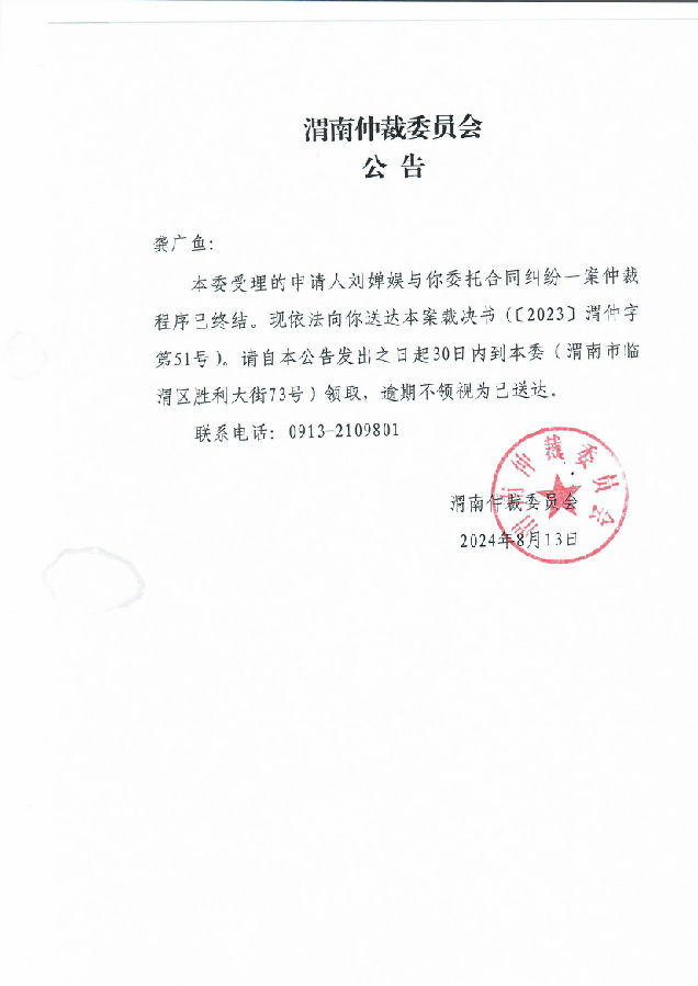 龔廣魚(yú)與劉嬋娛委托合同糾紛案公告