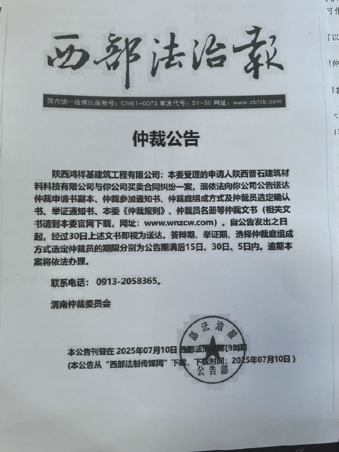 陜西普石建筑材料科技有限公司與陜西鴻祥基建筑工程有限公司買賣合同糾紛案公告